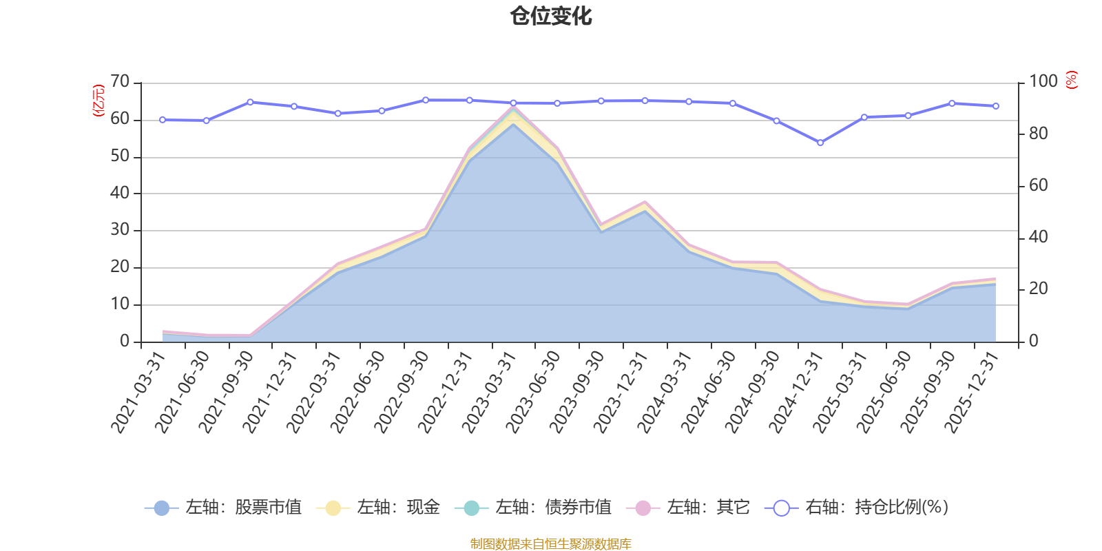 据定期报告数据统计,近三年平均股票仓位为89.5%,同类平均为88.23%。2022年三季度末基金达到93.29%的最高仓位,2024年末最低,为76.86%。
