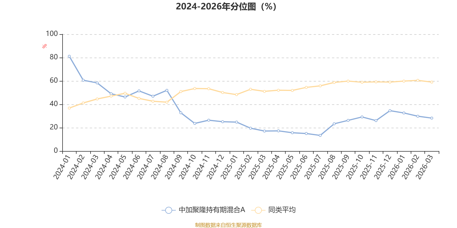 通过所选区间该基金净值增长率分位图,可以观察该基金与同类基金业绩比较情况。图为坐标原点到区间内某时点的净值增长率在同类基金中的分位数。