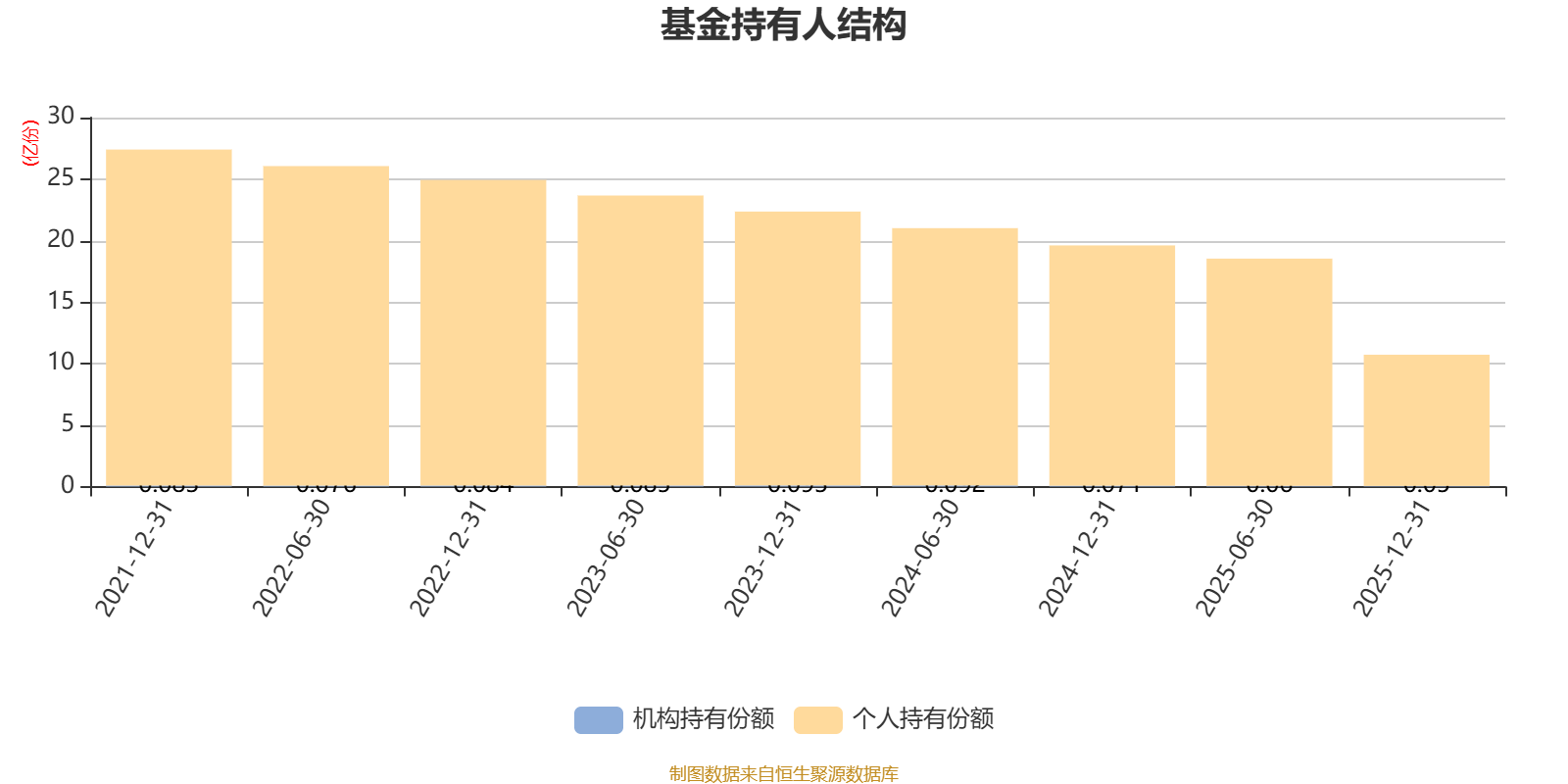 截至2025年12月31日,基金持有人共计1.08万户,合计持有10.72亿份。其中管理人员工持有398.02万份,占比0.37%,机构持有份额占比0.47%,个人投资者占比99.53%。