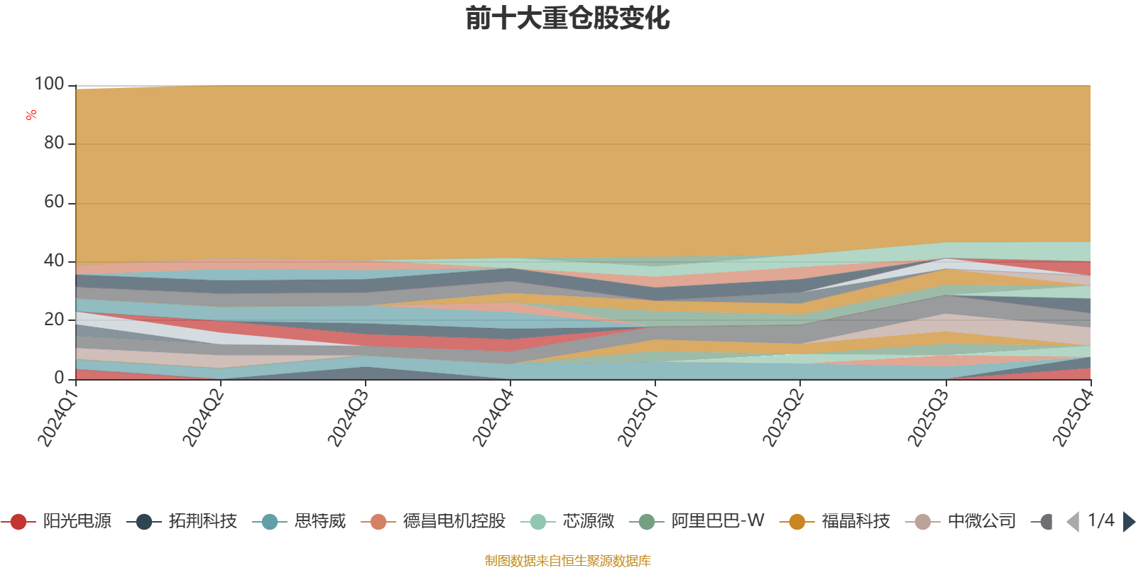 截至2025年末,基金十大重仓股分别是中芯国际、中微公司、国睿科技、寒武纪、金盘科技、工业富联、阳光电源、芯源微、拓荆科技、睿创微纳。