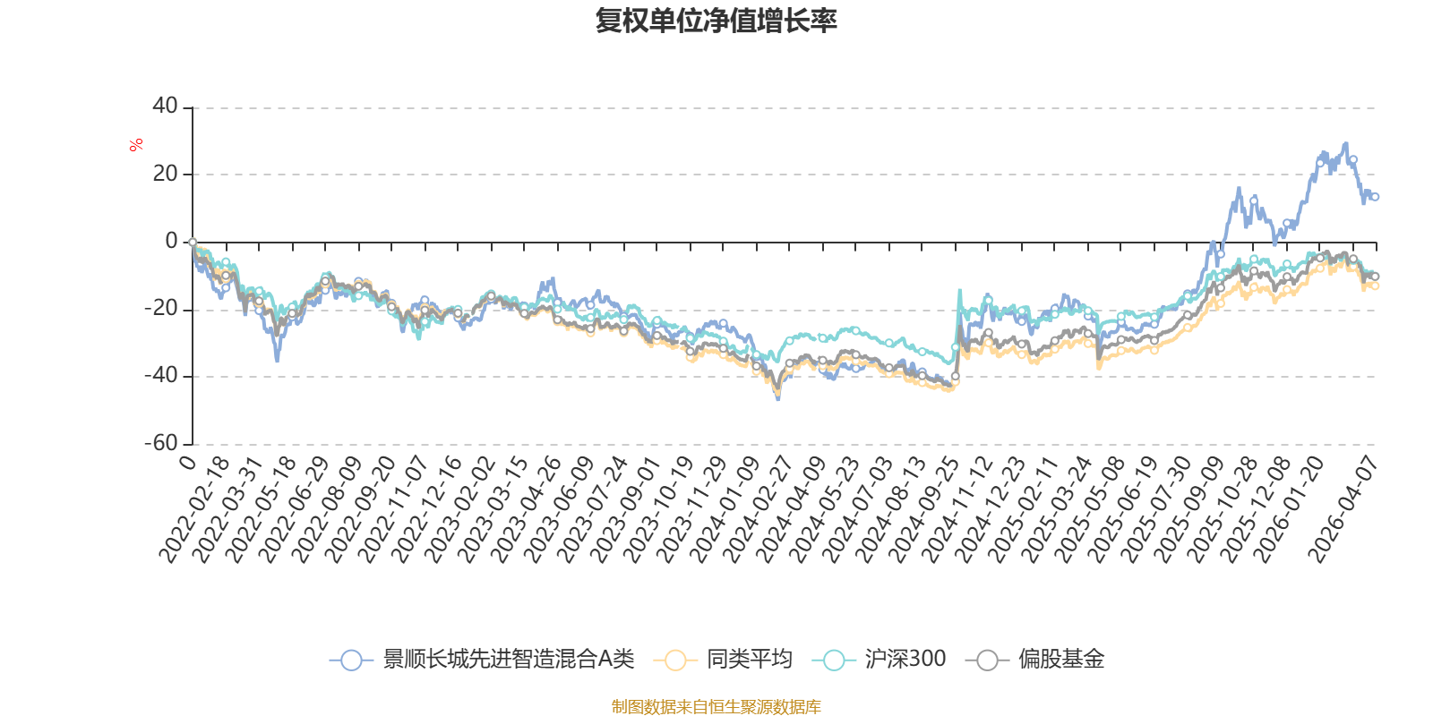 截至4月7日,景顺长城先进智造混合A类近三个月复权单位净值增长率为-3.88%,位于同类可比基金76/185;近半年复权单位净值增长率为-0.59%,位于同类可比基金76/185;近一年复权单位净值增长率为66.42%,位于同类可比基金29/185;近三年复权单位净值增长率为28.52%,位于同类可比基金39/177。