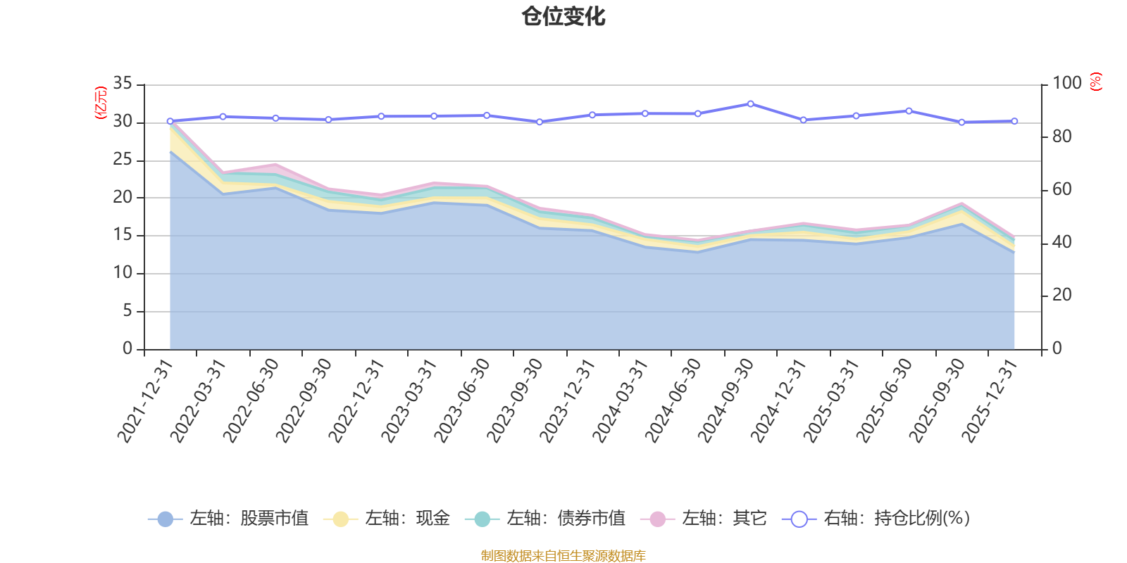 据定期报告数据统计,近三年平均股票仓位为88.18%,同类平均为87.64%。2024年三季度末基金达到92.69%的最高仓位,2025年三季度末最低,为85.72%。