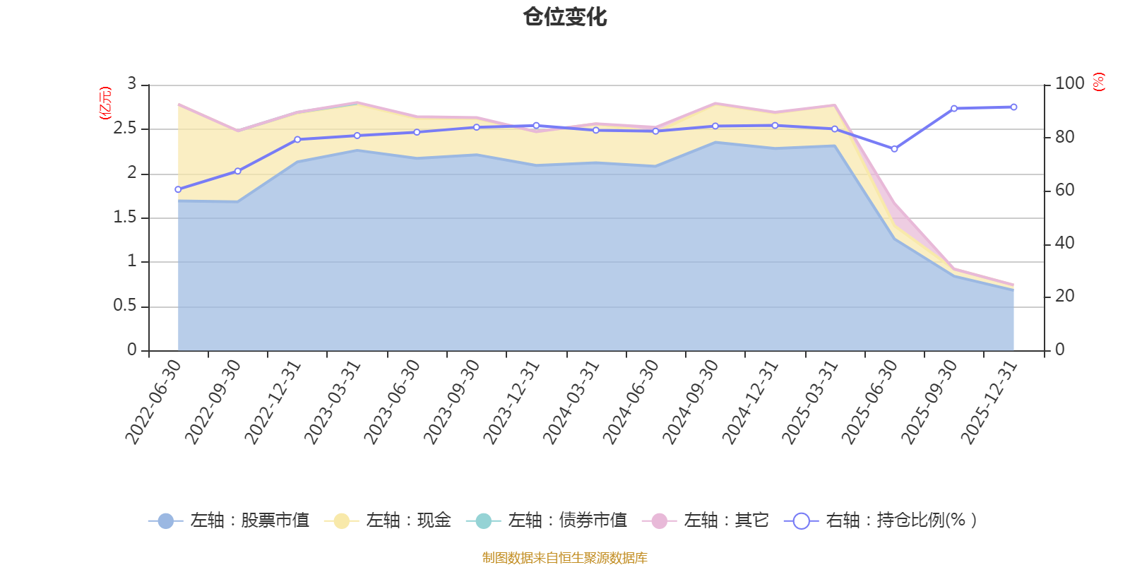 据定期报告数据统计,近三年平均股票仓位为84.03%,同类平均为85.83%。2025年末基金达到91.62%的最高仓位,2022年上半年末最低,为60.64%。