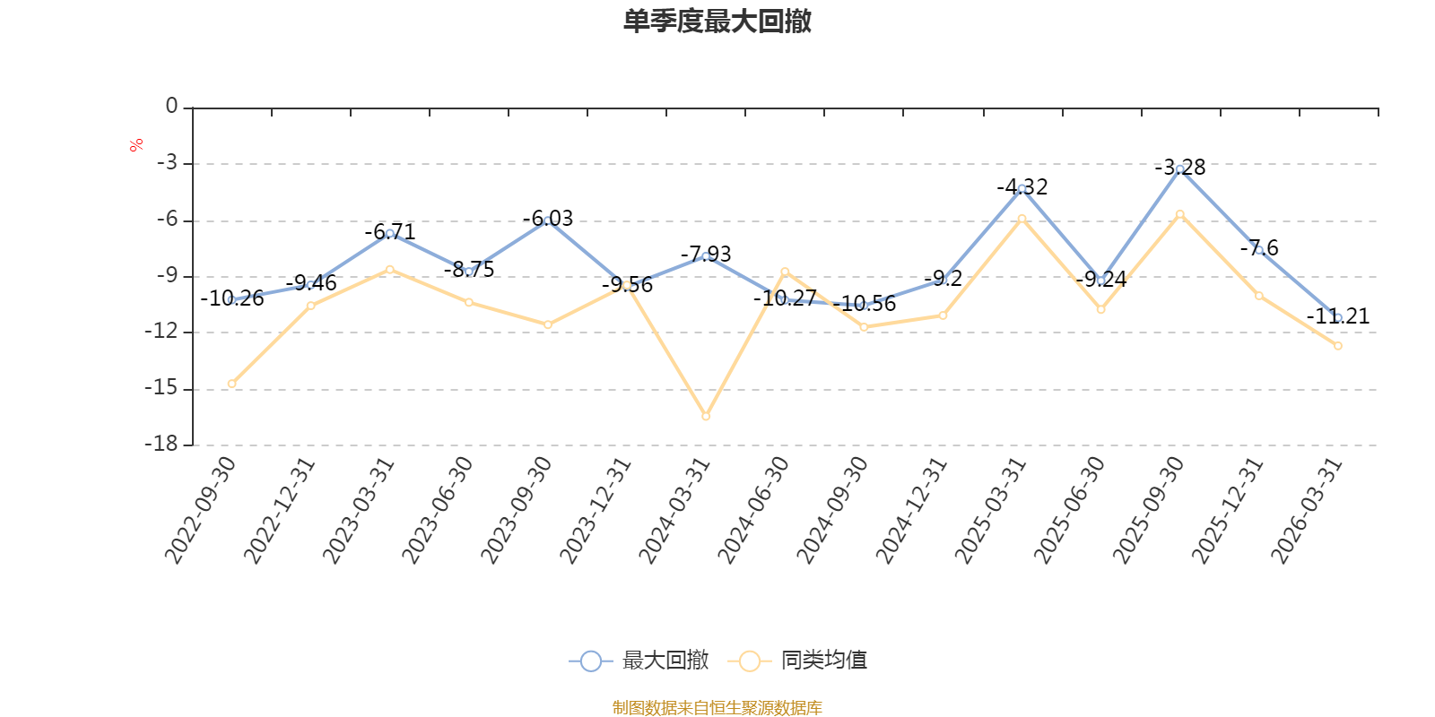 截至4月7日,基金近三年最大回撤为19.13%,同类可比基金排名27/551。单季度最大回撤出现在2026年一季度,为11.21%。