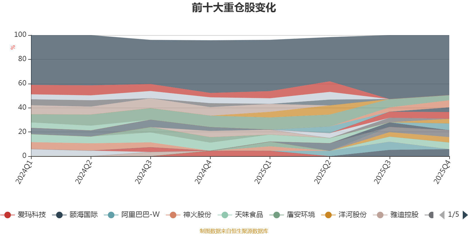 截至2025年末,基金十大重仓股分别是李宁、颐海国际、敏华控股、欧普照明、中炬高新、天味食品、洋河股份、腾讯控股、景津装备、龙湖集团。