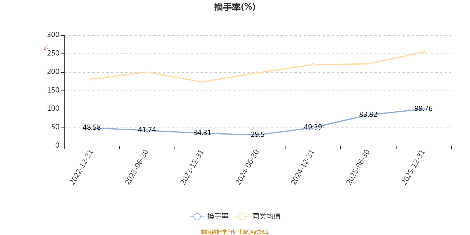截至2025年12月31日,基金最近一年换手率约173.61%,持续低于同类均值。