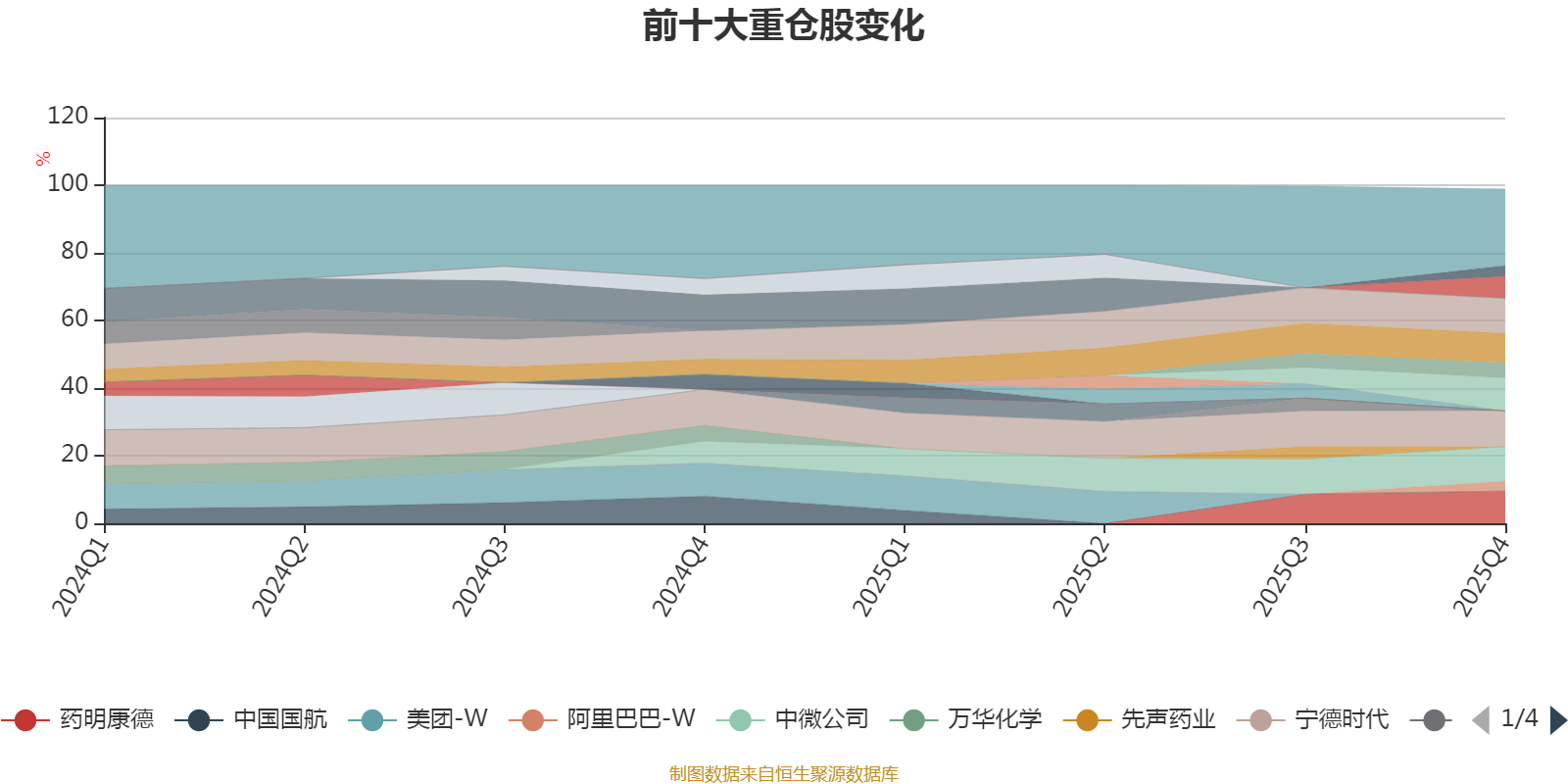 该基金持股集中度较高,近2年前十大重仓股集中度长期超过60%。截至2025年末,基金十大重仓股分别是宁德时代、腾讯控股、中微公司、新易盛、药明康德、翰森制药、泡泡玛特、药明生物、雅克科技、阿里巴巴-W。