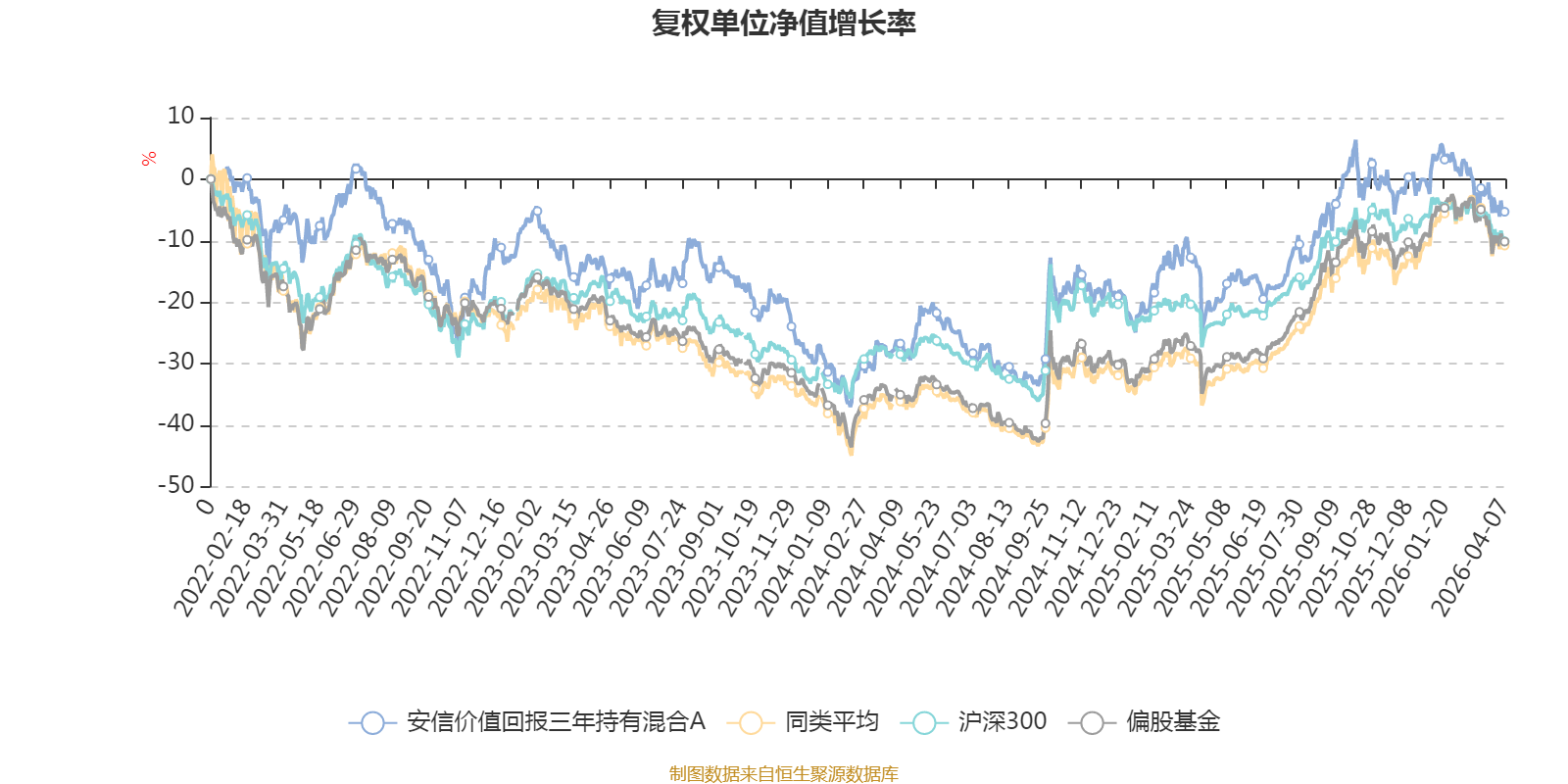 截至4月7日,安信价值回报三年持有混合A近三个月复权单位净值增长率为-9.03%,位于同类可比基金229/265;近半年复权单位净值增长率为-9.97%,位于同类可比基金232/265;近一年复权单位净值增长率为25.85%,位于同类可比基金200/265;近三年复权单位净值增长率为9.29%,位于同类可比基金151/261。