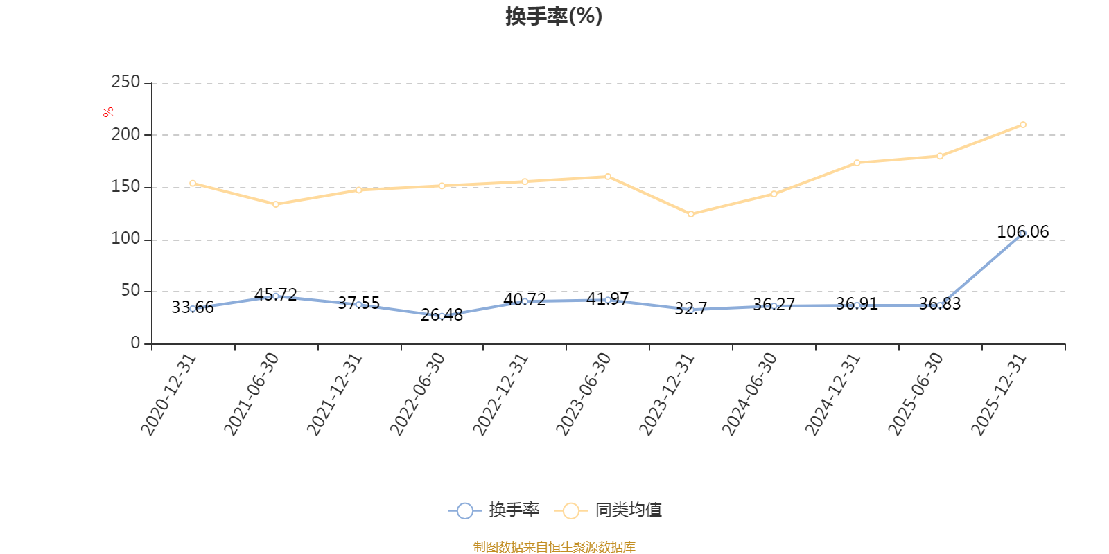 截至2025年12月31日,基金最近一年换手率约136.67%,持续低于同类均值。