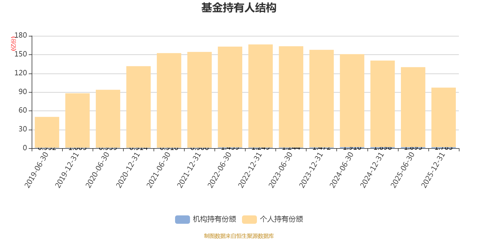 截至2025年12月31日,基金持有人共计53.78万户,合计持有97.17亿份。其中管理人员工持有2436.41万份,占比0.25%,机构持有份额占比1.83%,个人投资者占比98.17%。
