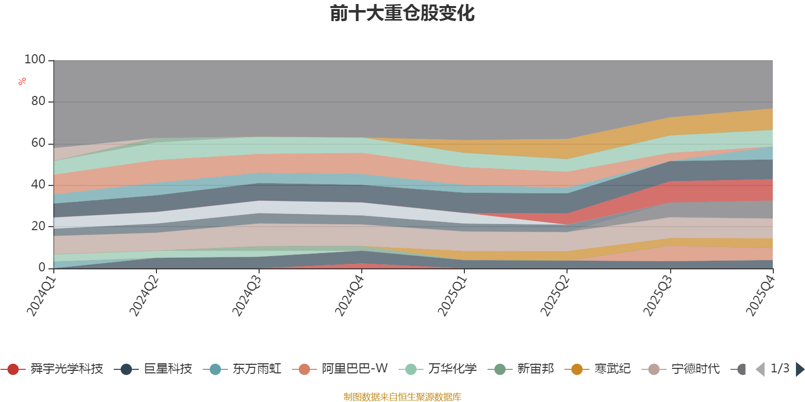 该基金持股集中度较高。截至2025年末,基金十大重仓股分别是新易盛、胜宏科技、宁德时代、腾讯控股、东山精密、立讯精密、迈为股份、阿里巴巴-W、寒武纪、巨星科技。