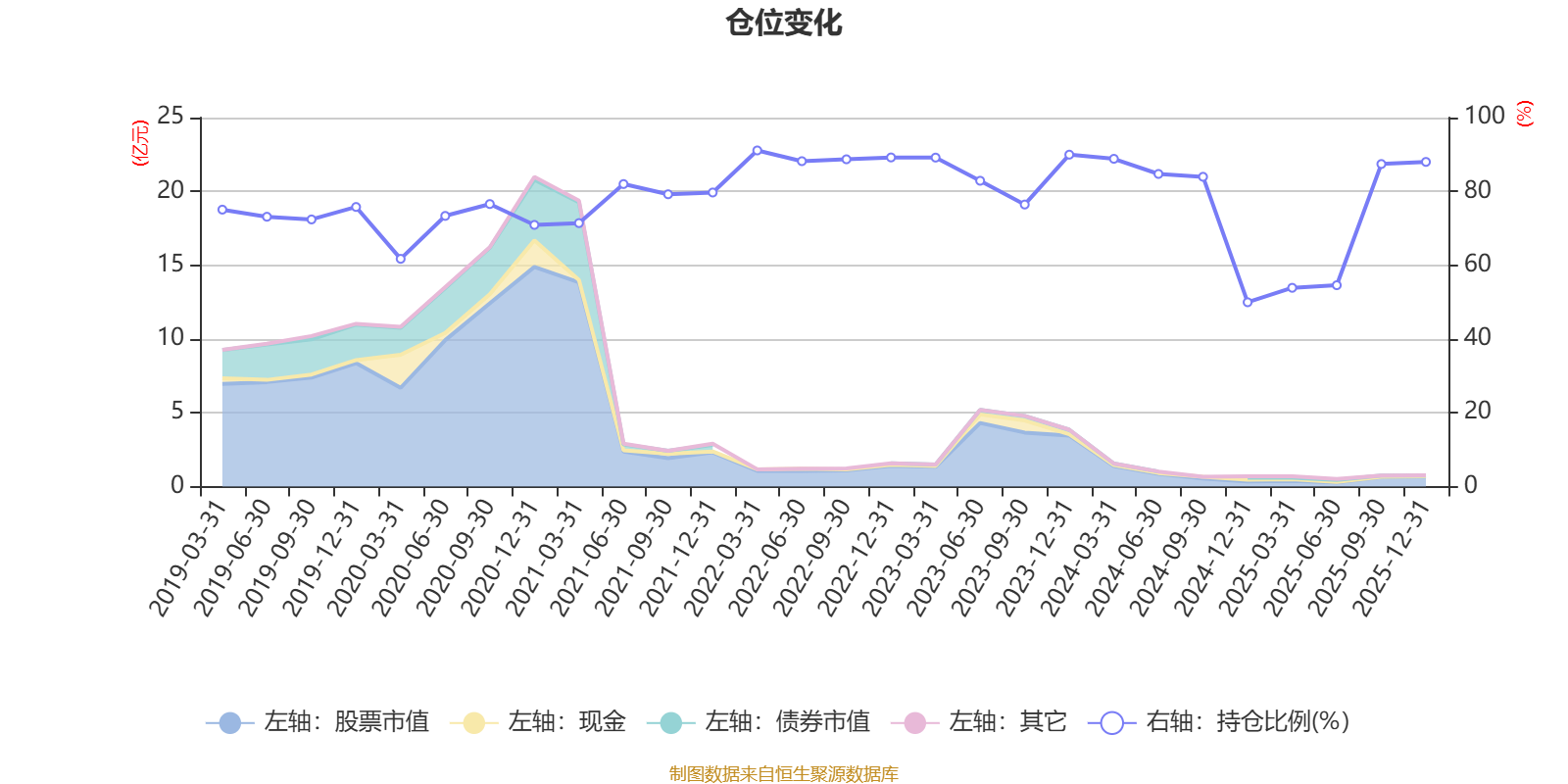 据定期报告数据统计,近三年平均股票仓位为77.48%,同类平均为72.57%。2022年一季度末基金达到91.1%的最高仓位,2024年末最低,为49.95%。