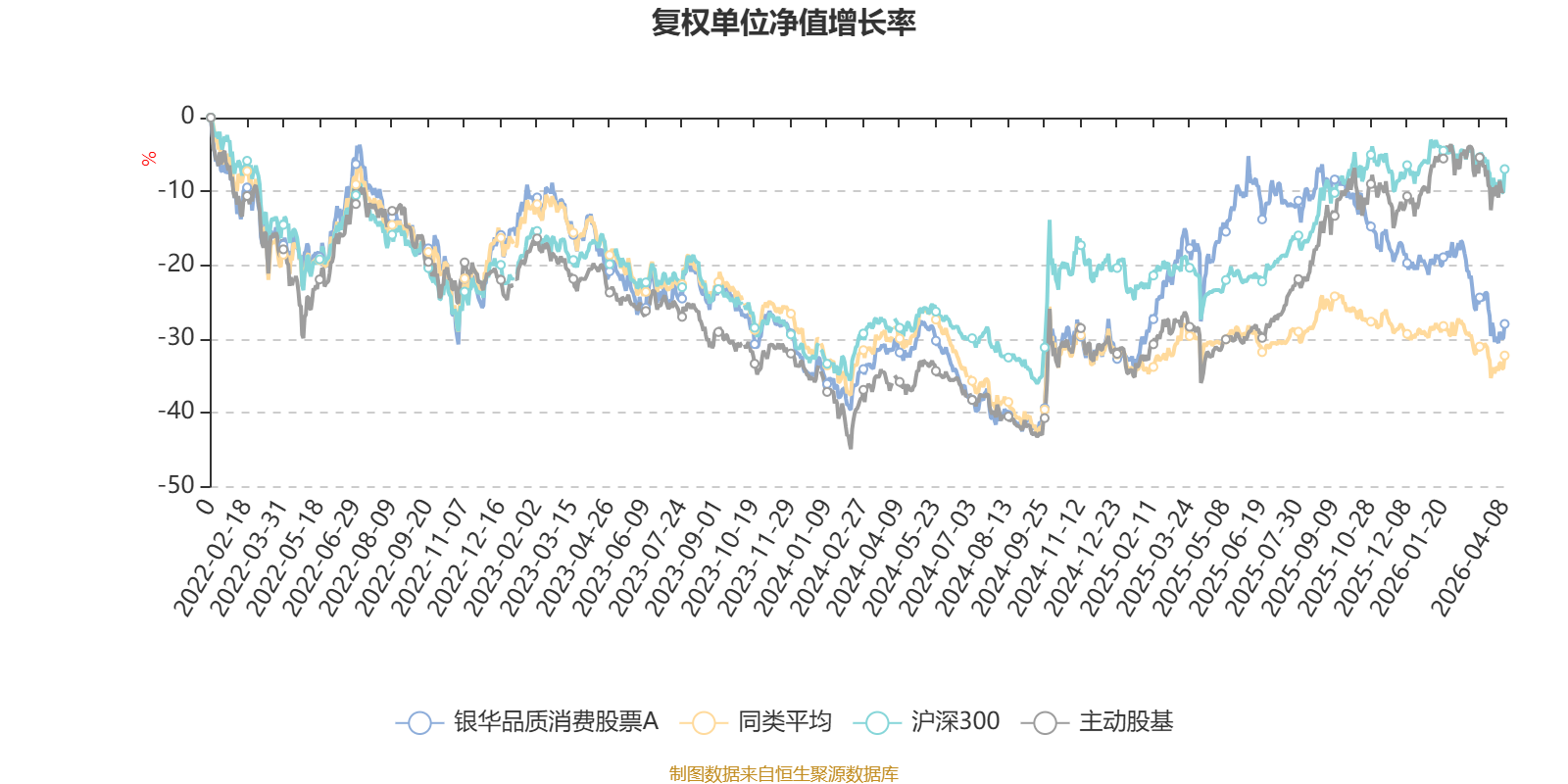 截至4月8日,银华品质消费股票A近三个月复权单位净值增长率为-10.09%,位于同类可比基金37/43;近半年复权单位净值增长率为-19.75%,位于同类可比基金40/43;近一年复权单位净值增长率为-2.78%,位于同类可比基金21/43;近三年复权单位净值增长率为-15.88%,位于同类可比基金17/41。