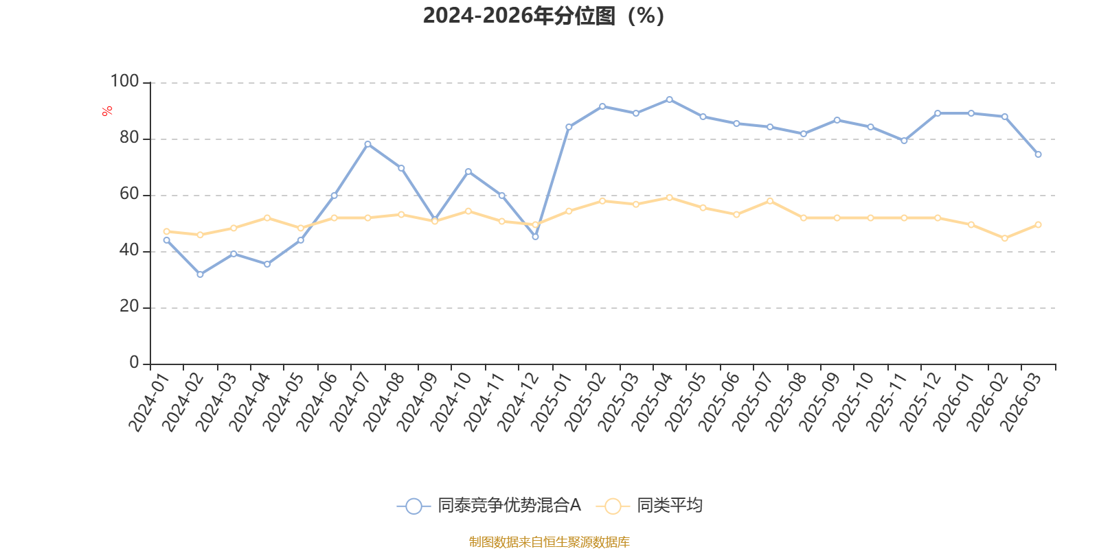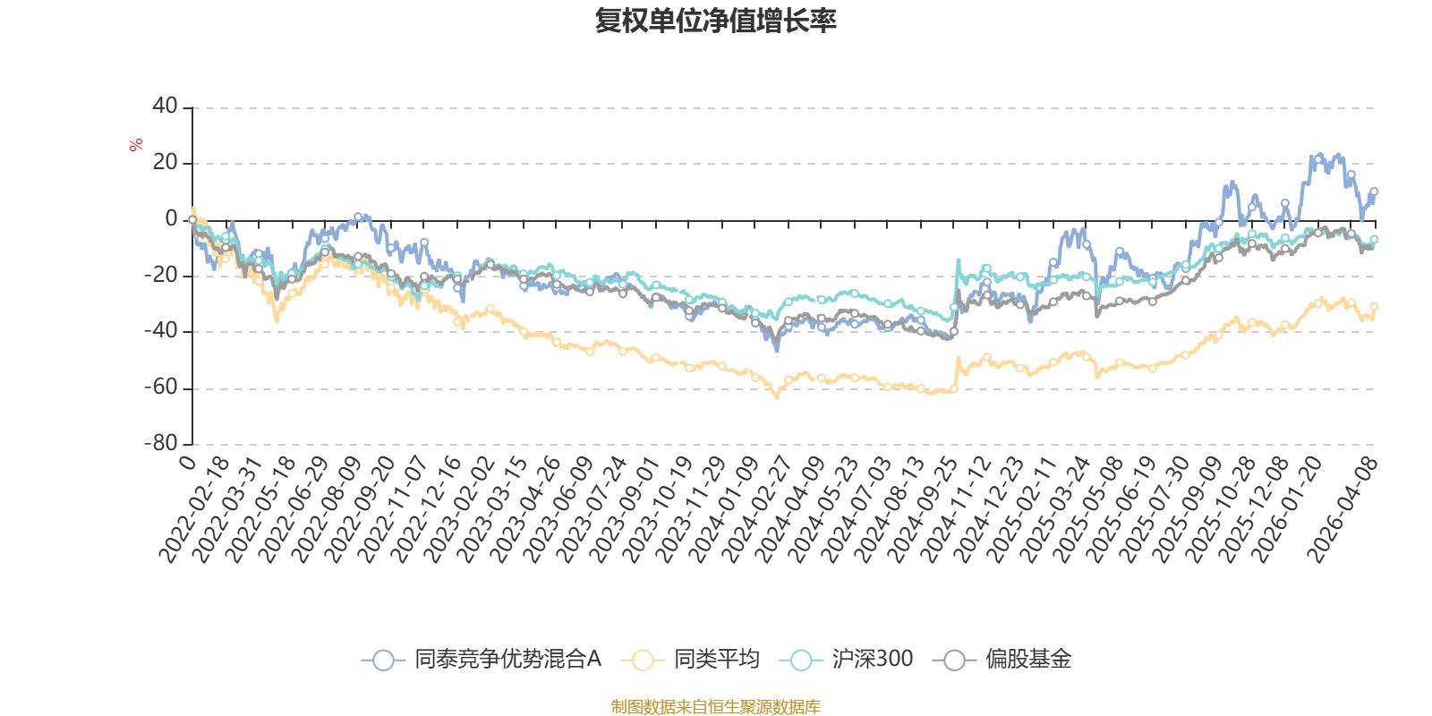 截至4月8日,同泰竞争优势混合A近三个月复权单位净值增长率为-2.52%,位于同类可比基金59/100;近半年复权单位净值增长率为-1.17%,位于同类可比基金54/100;近一年复权单位净值增长率为58.03%,位于同类可比基金26/99;近三年复权单位净值增长率为46.53%,位于同类可比基金5/76。