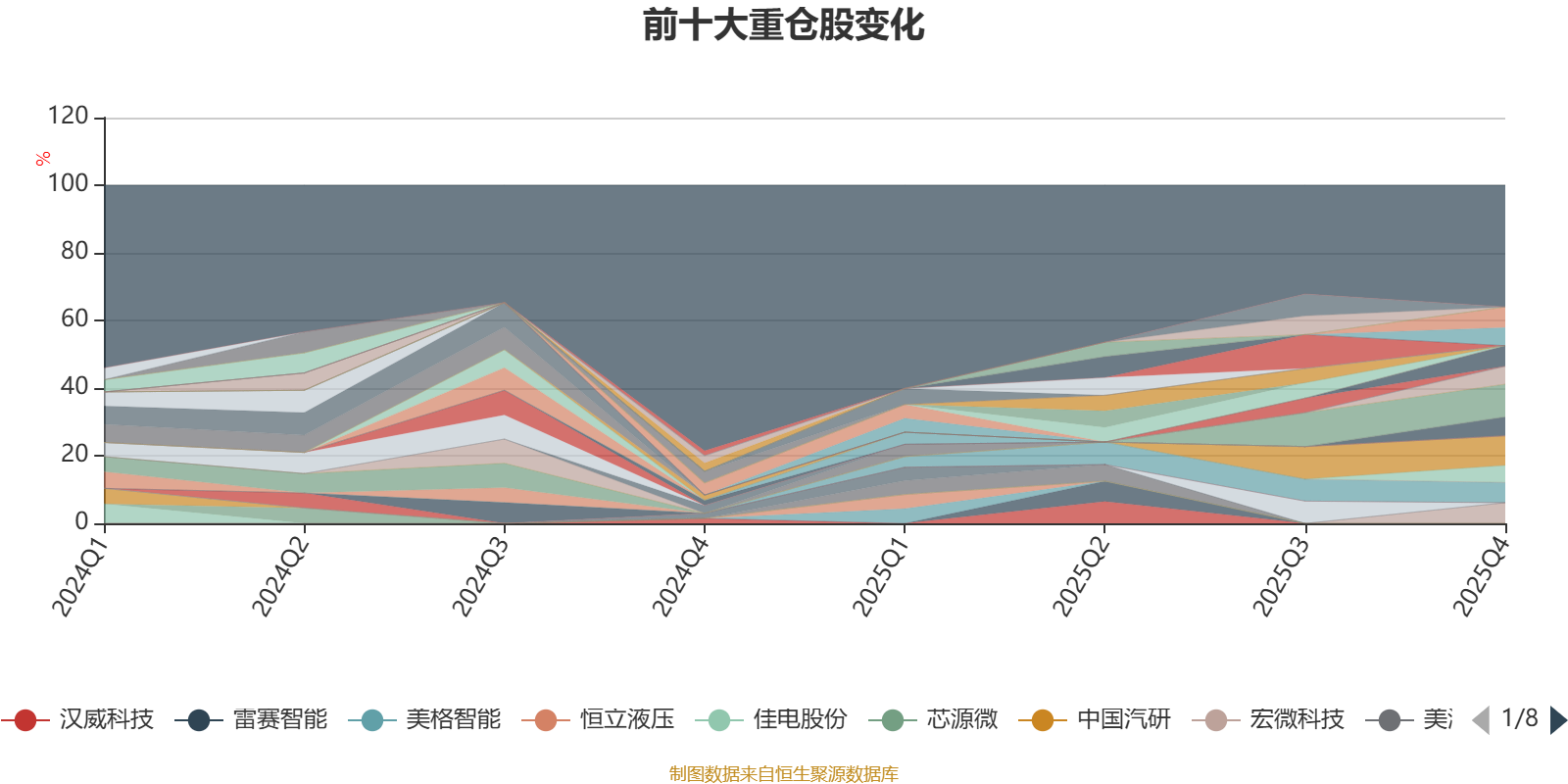 截至2025年末,基金十大重仓股分别是东杰智能、上纬新材、睿能科技、宏微科技、日盈电子、浙江荣泰、五洲新春、长盈精密、恒勃股份、金沃股份。