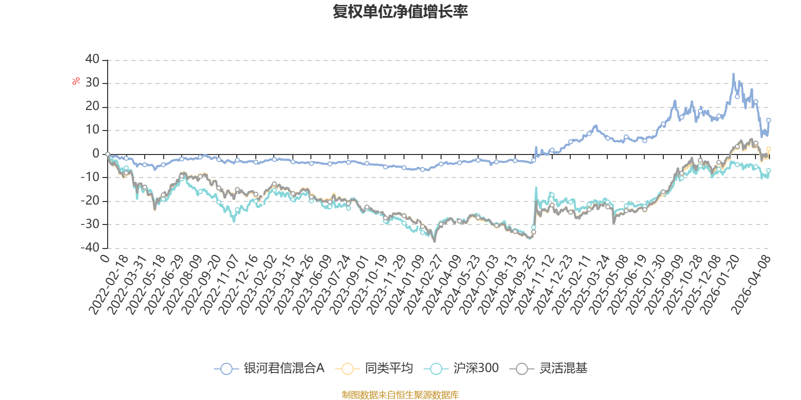 截至4月8日,银河君信混合A近三个月复权单位净值增长率为-10.16%,位于同类可比基金1225/1287;近半年复权单位净值增长率为-5.48%,位于同类可比基金1088/1286;近一年复权单位净值增长率为8.49%,位于同类可比基金1090/1286;近三年复权单位净值增长率为18.67%,位于同类可比基金524/1286。