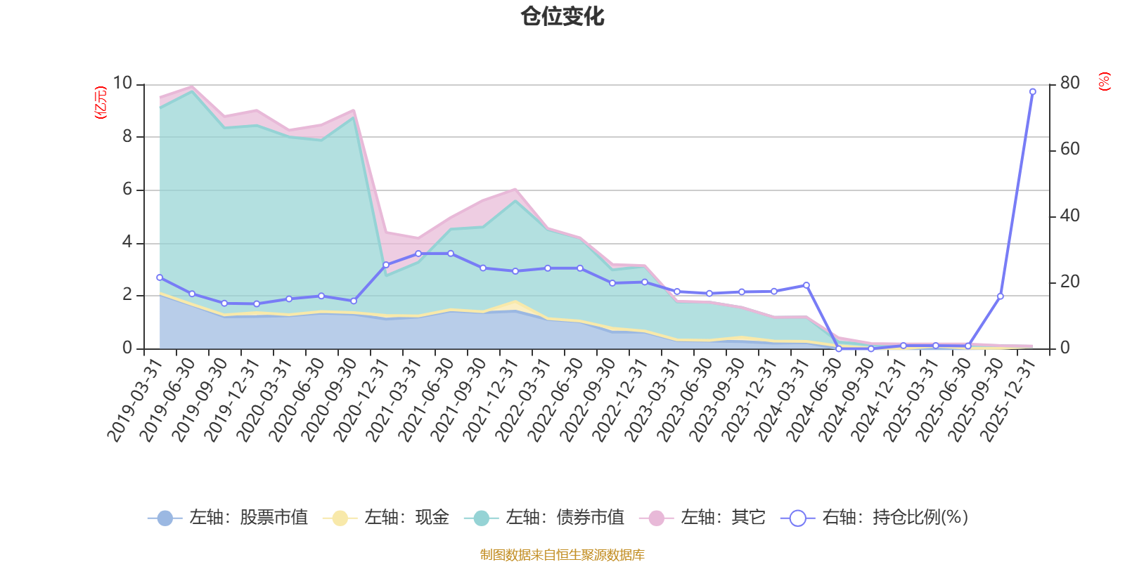 据定期报告数据统计,近三年平均股票仓位为15.36%,同类平均为72.57%。2025年末基金达到77.79%的最高仓位,2025年上半年末最低,为0.83%。