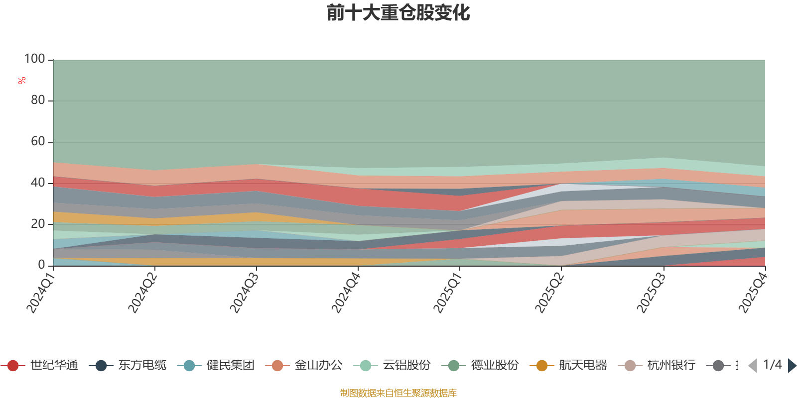 截至2025年末,基金十大重仓股分别是杭州银行、贵州茅台、海尔智家、宁德时代、恒瑞医药、中国平安、东方电缆、中天科技、世纪华通、云铝股份。