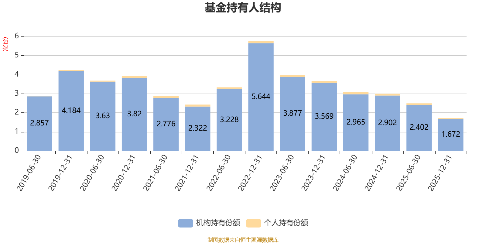 截至2025年12月31日,基金持有人共计832户,合计持有1.72亿份。其中管理人员工持有116.38万份,占比0.68%,机构持有份额占比97.08%,个人投资者占比2.92%。