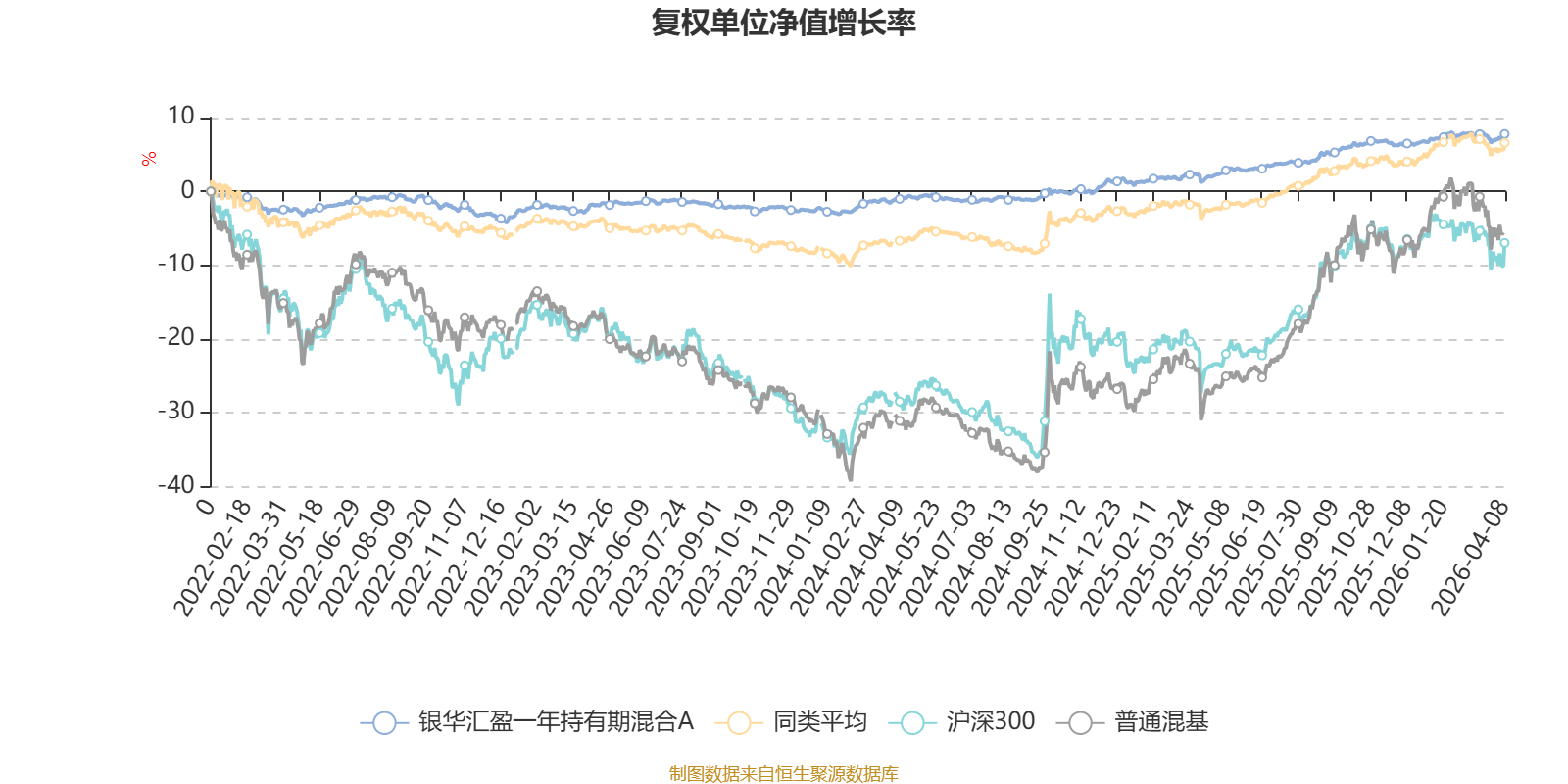 截至4月8日,银华汇盈一年持有期混合A近三个月复权单位净值增长率为0.76%,位于同类可比基金245/629;近半年复权单位净值增长率为1.32%,位于同类可比基金328/629;近一年复权单位净值增长率为6.31%,位于同类可比基金382/629;近三年复权单位净值增长率为9.69%,位于同类可比基金334/581。