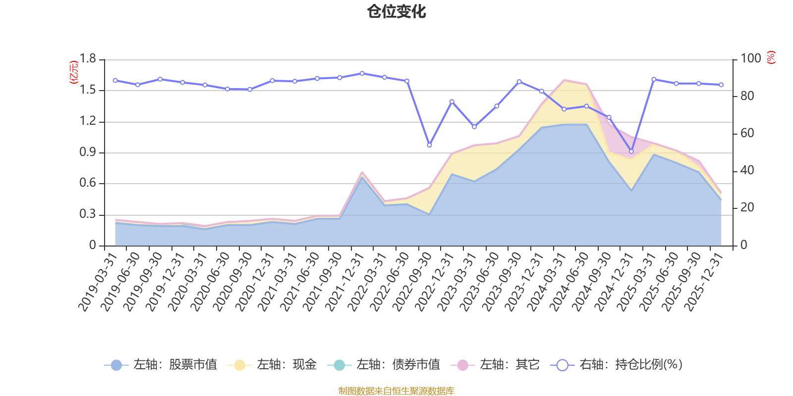 据定期报告数据统计,近三年平均股票仓位为77.28%,同类平均为84.04%。2021年末基金达到92.49%的最高仓位,2024年末最低,为50.62%。