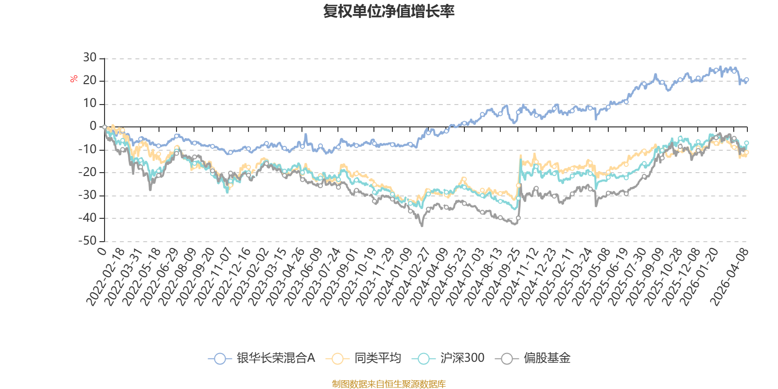 截至4月8日,银华长荣混合A近三个月复权单位净值增长率为-2.82%,位于同类可比基金5/16;近半年复权单位净值增长率为3.02%,位于同类可比基金6/16;近一年复权单位净值增长率为14.76%,位于同类可比基金10/16;近三年复权单位净值增长率为32.80%,位于同类可比基金3/12。