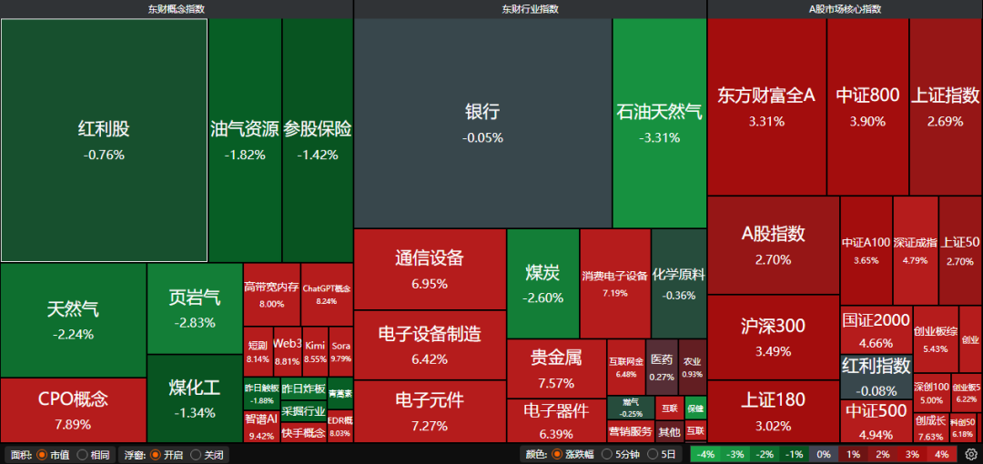 A股三大指数昨日集体大涨,沪指涨2.70%,深证成指涨4.79%,创业板指涨5.91%。沪深京三市成交额达到2.45万亿。行业板块几乎全线上扬,贵金属、元件、半导体、传媒、航天装备、软件开发、消费电子板块涨幅居前,仅石油石化、煤炭、医药商业板块逆市下跌。