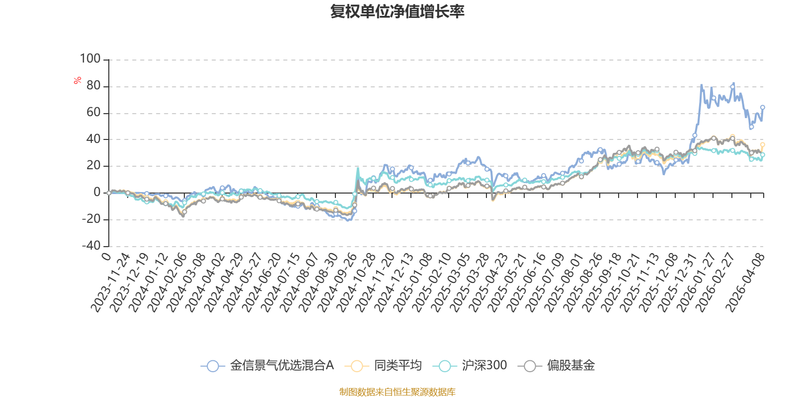 截至4月8日,金信景气优选混合A近三个月复权单位净值增长率为2.83%,位于同类可比基金215/689;近半年复权单位净值增长率为26.85%,位于同类可比基金38/689;近一年复权单位净值增长率为55.98%,位于同类可比基金183/685。
