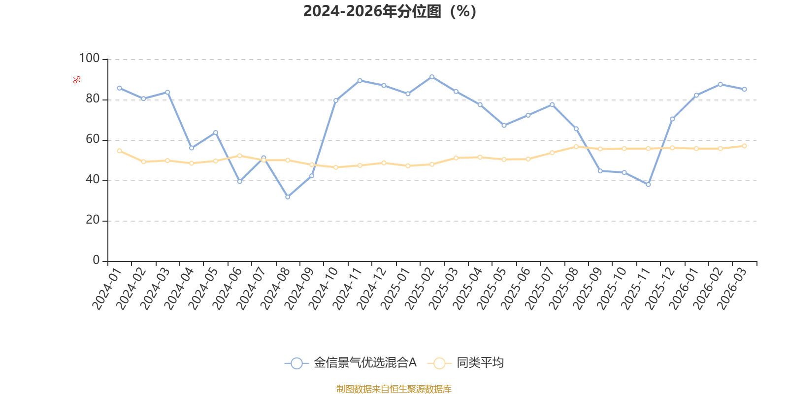 通过所选区间该基金净值增长率分位图,可以观察该基金与同类基金业绩比较情况。图为坐标原点到区间内某时点的净值增长率在同类基金中的分位数。