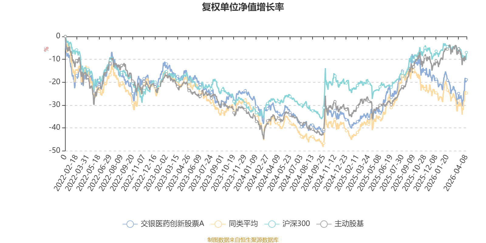 截至4月8日,交银医药创新股票A近三个月复权单位净值增长率为-1.37%,位于同类可比基金16/57;近半年复权单位净值增长率为-10.01%,位于同类可比基金25/57;近一年复权单位净值增长率为27.39%,位于同类可比基金29/57;近三年复权单位净值增长率为-3.95%,位于同类可比基金16/48。