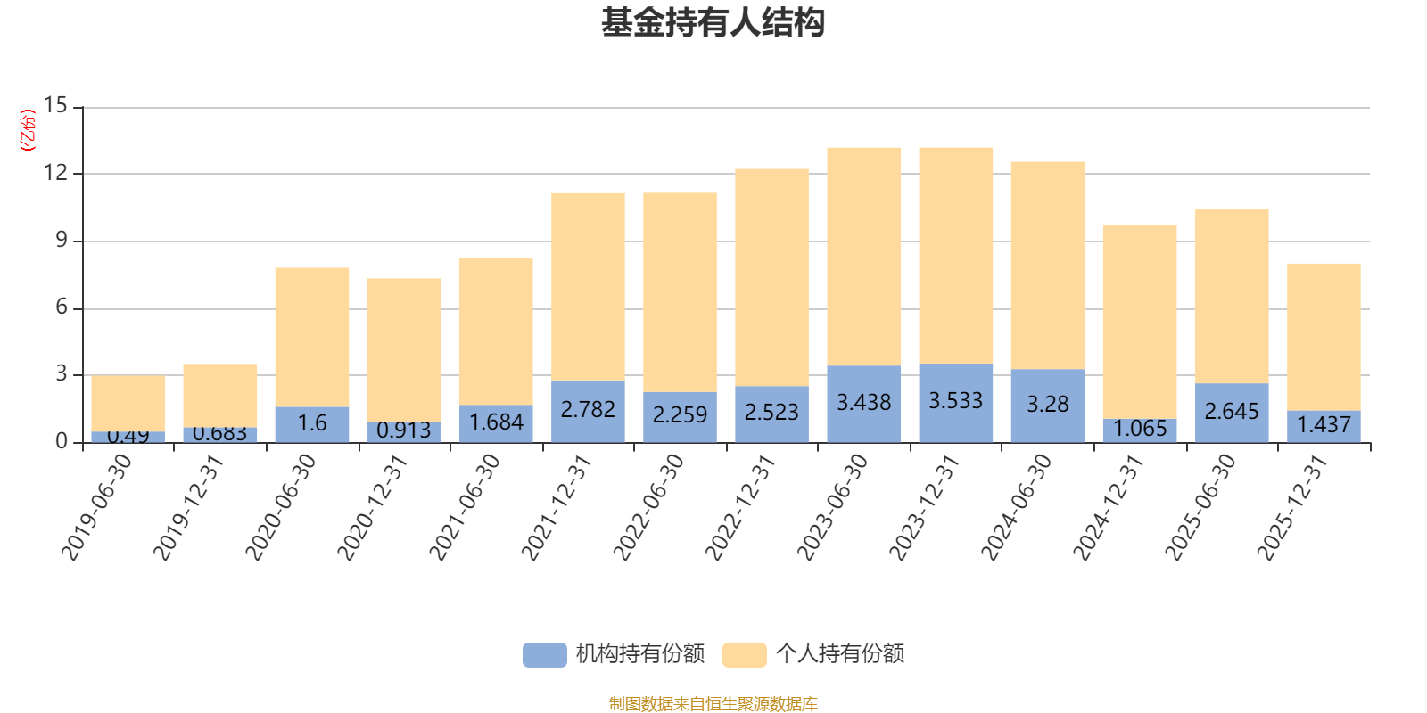 截至2025年12月31日,基金持有人共计12.09万户,合计持有7.99亿份。其中管理人员工持有65.57万份,占比0.08%,机构持有份额占比17.98%,个人投资者占比82.02%。
