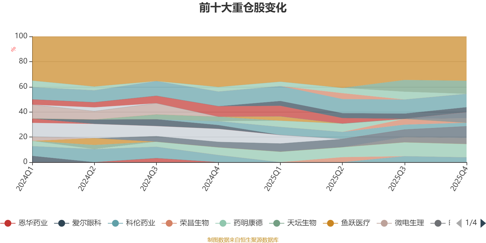 该基金持股集中度较高。截至2025年末,基金十大重仓股分别是恒瑞医药、药明康德、百利天恒、百济神州、百普赛斯、皓元医药、三生国健、科伦药业、英科医疗、新诺威。
