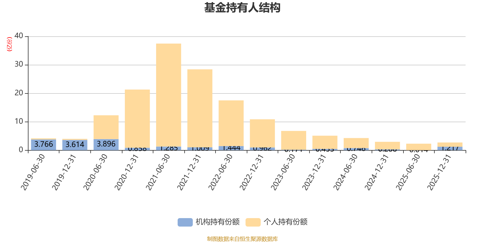 截至2025年12月31日,基金持有人共计4.15万户,合计持有2.71亿份。其中管理人员工持有64.69万份,占比0.24%,机构持有份额占比44.92%,个人投资者占比55.08%。
