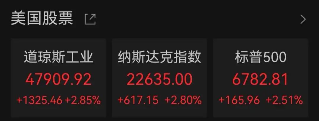 当地时间4月8日,美股三大股指全线收涨,Wind数据显示,截至收盘,道指涨2.85%,报47909.92点;标普500指数涨2.51%,报6782.81点;纳指涨2.8%,报22635点。