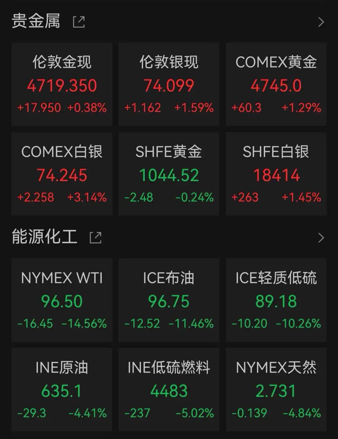 Wind数据显示,截至北京时间4月9日5:40,伦敦金现、COMEX黄金期货分别上涨0.38%、1.29%,报4719.35美元/盎司、4745美元/盎司;伦敦银现、COMEX白银期货分别上涨1.59%、3.14%,报74.099美元/盎司、74.245美元/盎司;NYMEX WTI原油期货主力合约、ICE布油期货主力合约分别下跌14.56%、11.46%,报96.5美元/桶、96.75美元/桶。