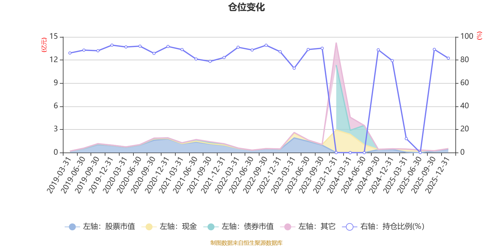 据定期报告数据统计,近三年平均股票仓位为50.31%,同类平均为72.57%。2019年末基金达到92.88%的最高仓位,2023年末最低,为0.06%。