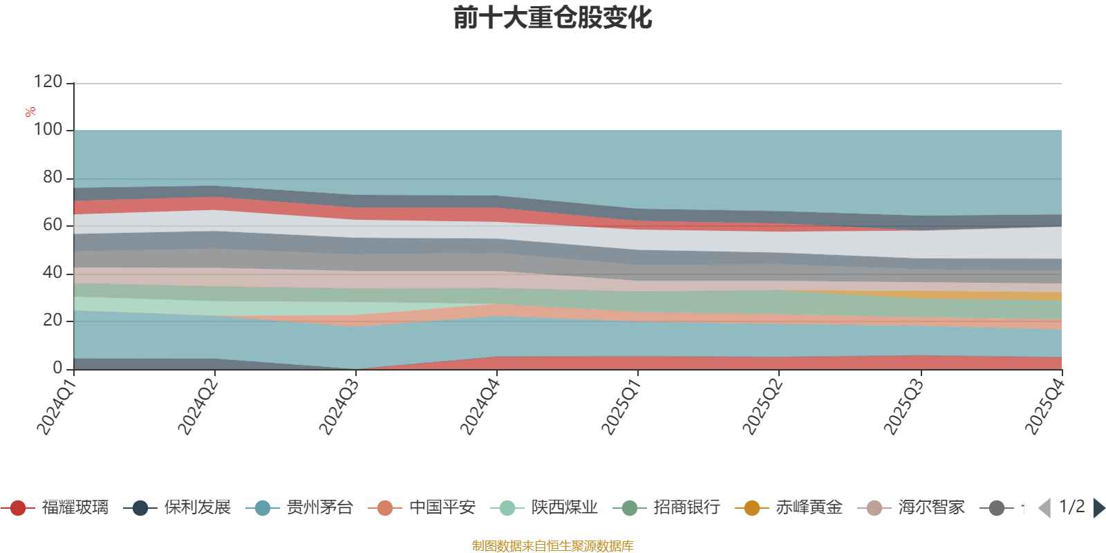 该基金持股集中度较高,且持股标的较为稳定,近2年前十大重仓股集中度长期超过60%。截至2025年末,基金十大重仓股分别是紫金矿业、贵州茅台、招商银行、长江电力、万华化学、恒瑞医药、福耀玻璃、中国平安、海尔智家、赤峰黄金。