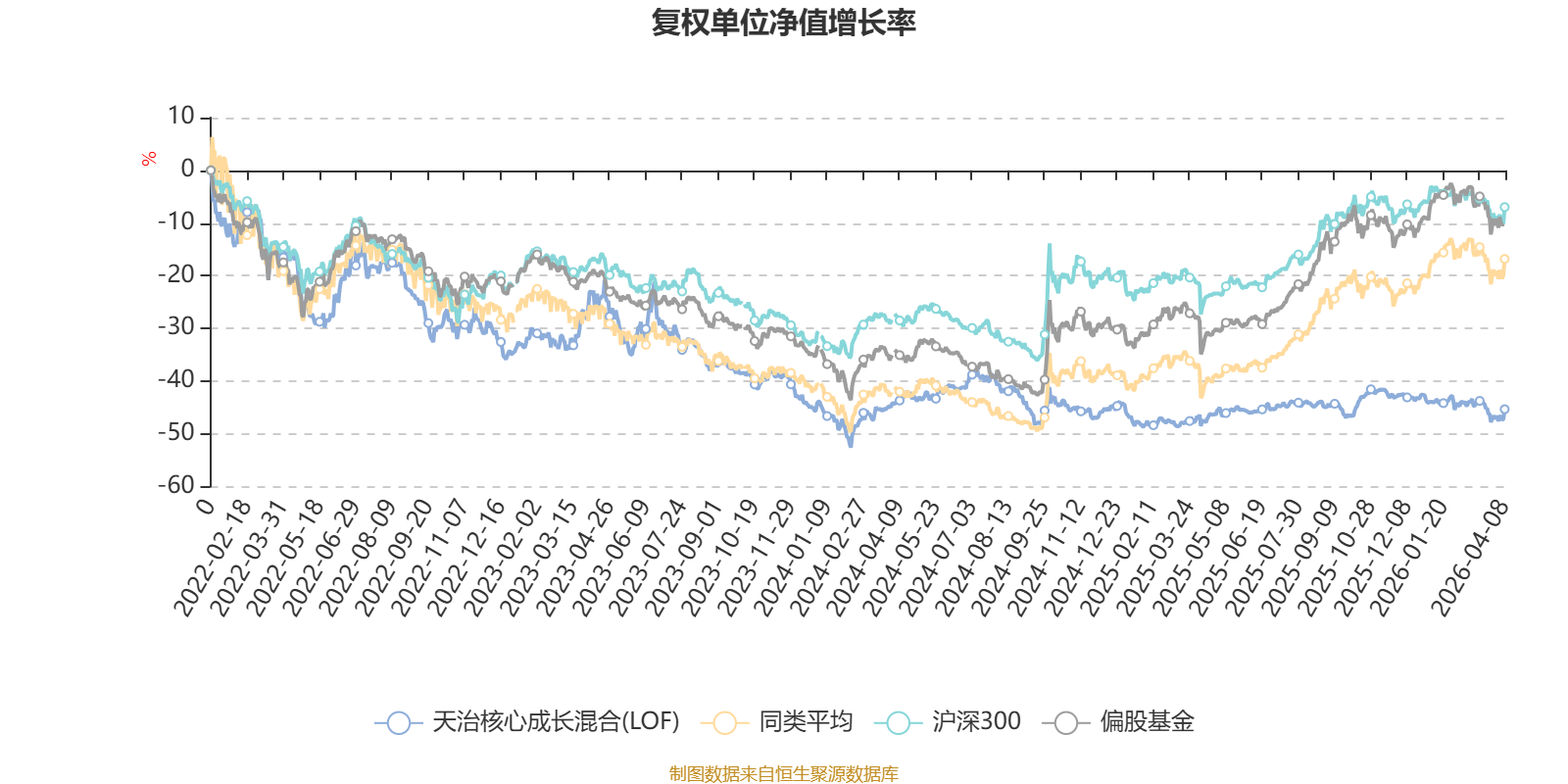 截至4月8日,天治核心成长混合(LOF)近三个月复权单位净值增长率为-2.29%,位于同类可比基金403/621;近半年复权单位净值增长率为2.53%,位于同类可比基金291/621;近一年复权单位净值增长率为4.27%,位于同类可比基金605/618;近三年复权单位净值增长率为-29.15%,位于同类可比基金556/559。