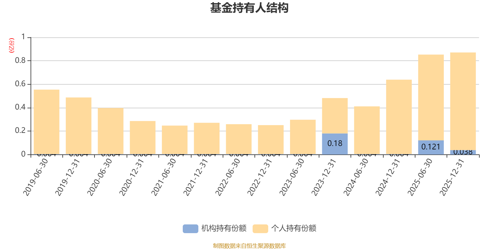 截至2025年12月31日,基金持有人共计8387户,合计持有8716.62万份。其中管理人员工持有8.34万份,占比0.10%,机构持有份额占比4.39%,个人投资者占比95.61%。