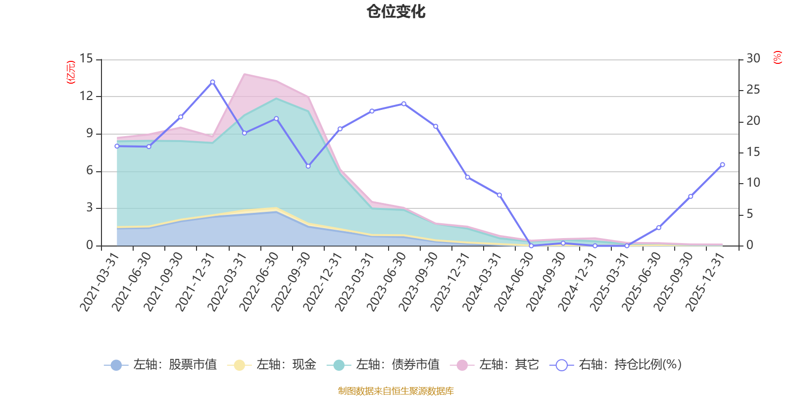 据定期报告数据统计,近三年平均股票仓位为8.94%,同类平均为19.2%。2021年末基金达到26.37%的最高仓位,2024年三季度末最低,为0.42%。