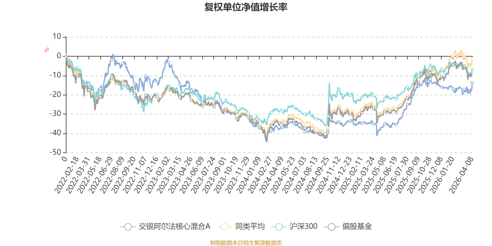 截至4月8日,交银阿尔法核心混合A近三个月复权单位净值增长率为2.69%,位于同类可比基金29/130;近半年复权单位净值增长率为-2.04%,位于同类可比基金83/130;近一年复权单位净值增长率为45.68%,位于同类可比基金58/130;近三年复权单位净值增长率为-0.15%,位于同类可比基金104/126。