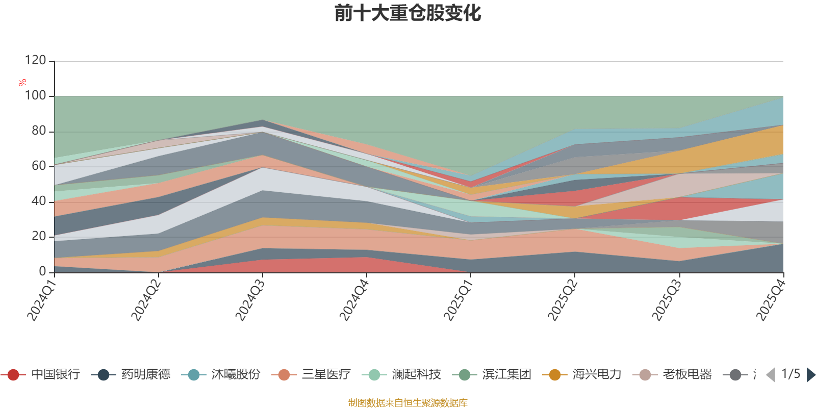 该基金持股集中度较高。截至2025年末,基金十大重仓股分别是贵州茅台、药明康德、恒瑞医药、五粮液、工商银行、泸州老窖、山西汾酒、华特达因、摩尔线程、沐曦股份。