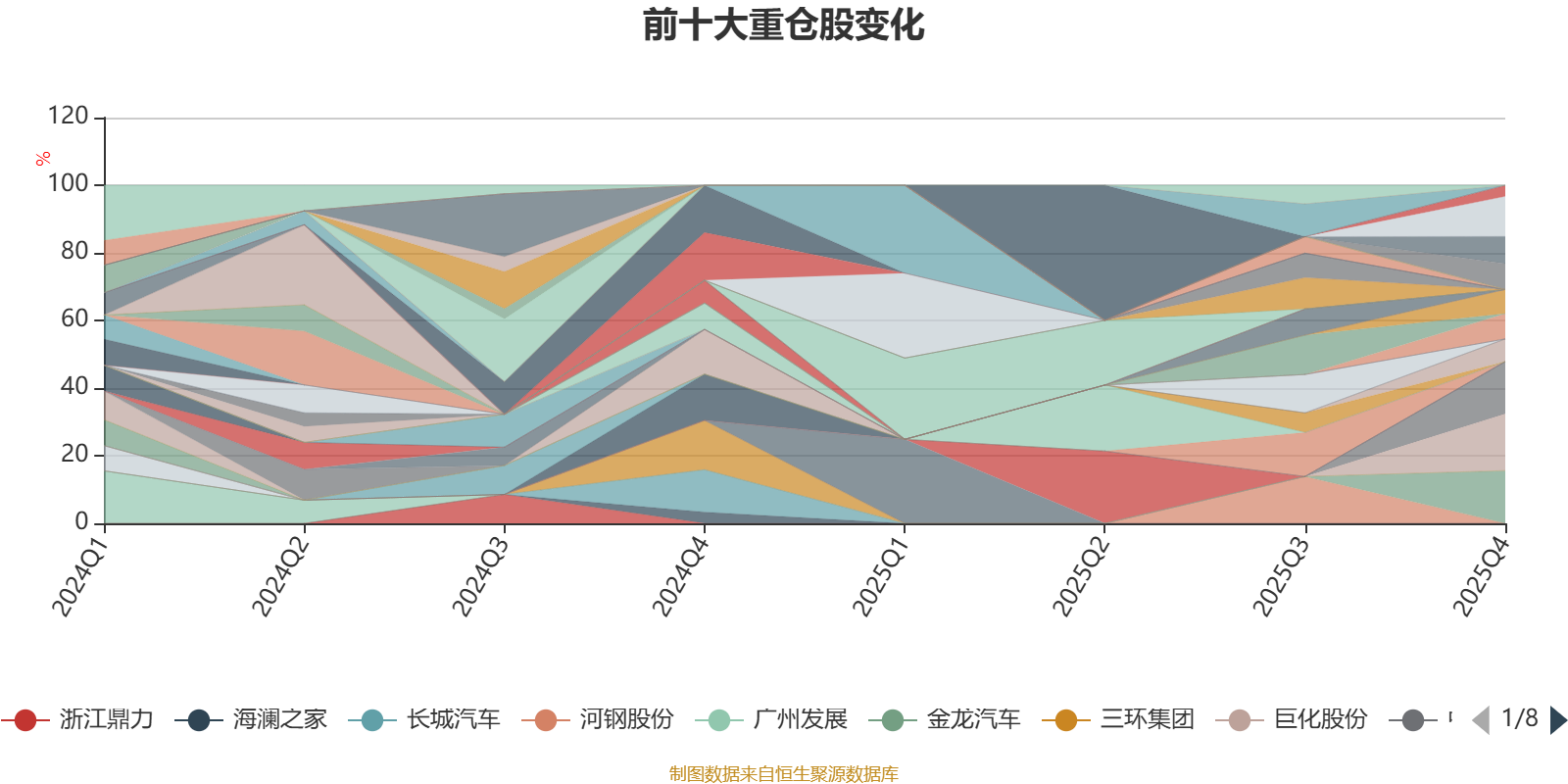 该基金持股集中度较高,近2年前十大重仓股集中度长期超过60%。截至2025年末,基金十大重仓股分别是巨化股份、金龙汽车、中芯国际、新凤鸣、紫金矿业、鼎龙股份、三美股份、天赐材料、TCL科技、胜宏科技。