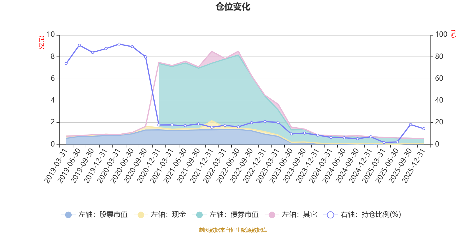 据定期报告数据统计,近三年平均股票仓位为9.32%,同类平均为72.57%。2020年一季度末基金达到91.63%的最高仓位,2025年一季度末最低,为1.99%。