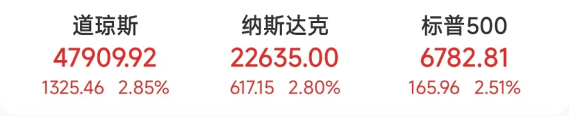 截至当天收盘,道指涨1325.46点,涨幅为2.85%,报47909.92点;纳指涨617.15点,涨幅为2.80%,报22635.00点;标普500指数涨165.96点,涨幅为2.51%,报6782.81点。