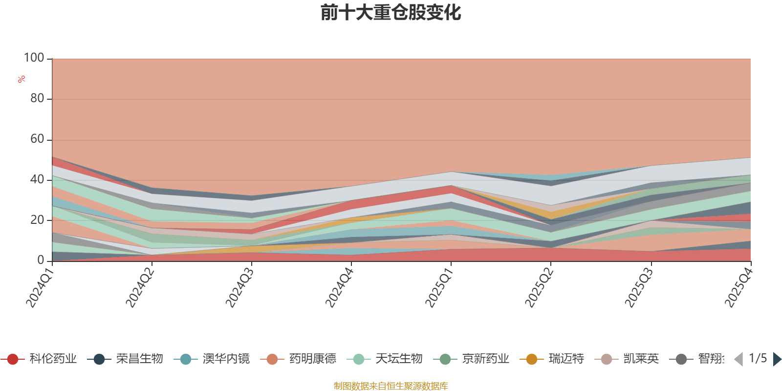 截至2025年末,基金十大重仓股分别是恒瑞医药、科伦药业、百济神州、药明康德、泽璟制药、皓元医药、百普赛斯、毕得医药、荣昌生物、奥浦迈。
