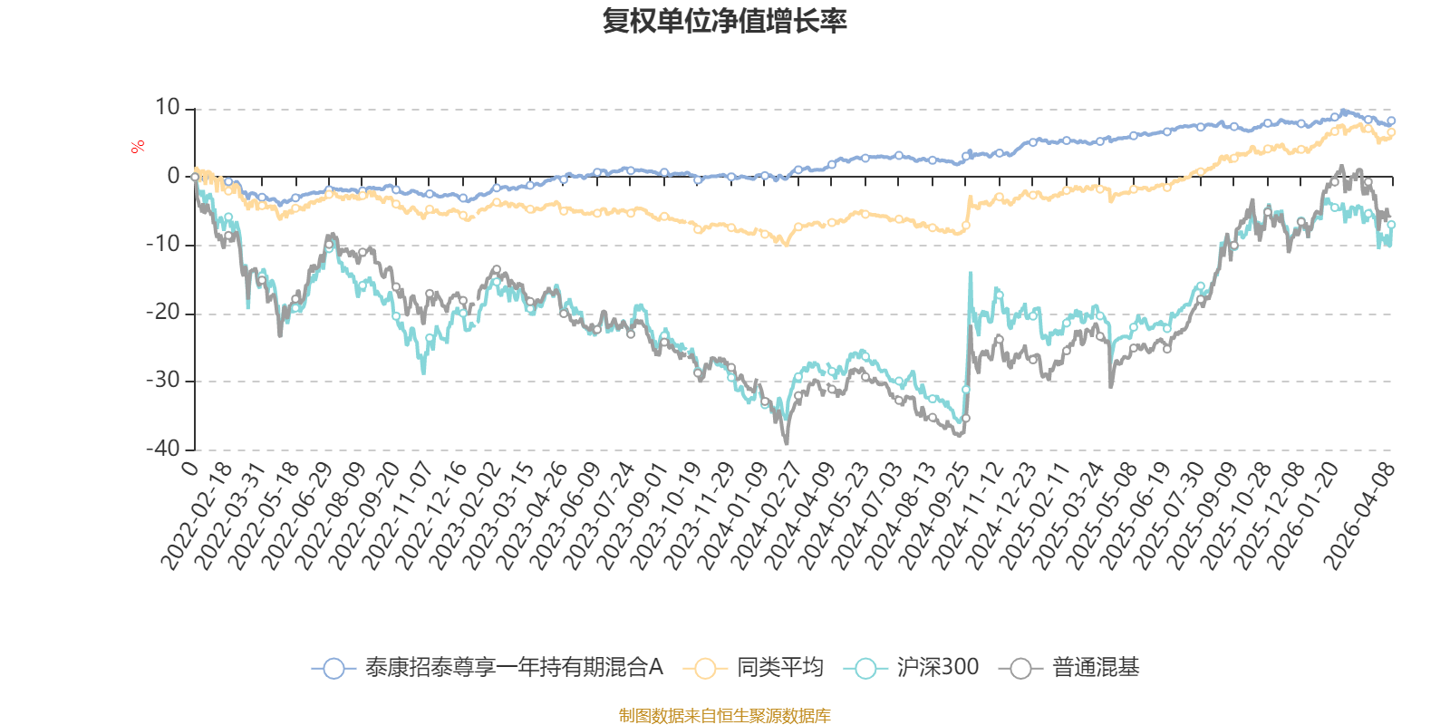 截至4月8日,泰康招泰尊享一年持有期混合A近三个月复权单位净值增长率为-0.06%,位于同类可比基金420/629;近半年复权单位净值增长率为1.36%,位于同类可比基金322/629;近一年复权单位净值增长率为2.81%,位于同类可比基金571/629;近三年复权单位净值增长率为8.73%,位于同类可比基金366/581。