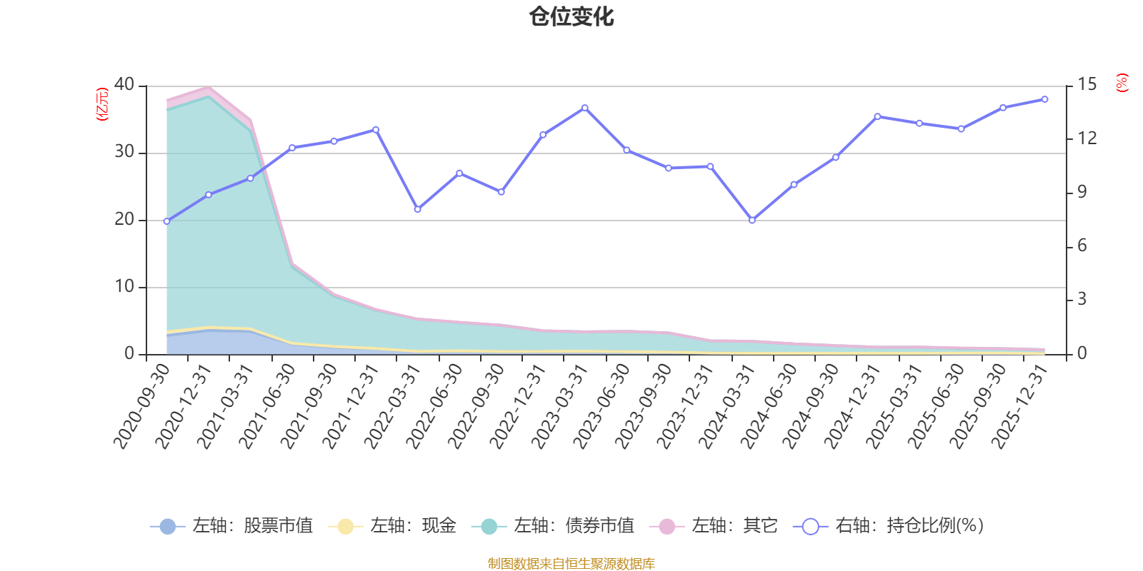 据定期报告数据统计,近三年平均股票仓位为11.73%,同类平均为19.2%。2025年末基金达到14.24%的最高仓位,2020年三季度末最低,为7.43%。