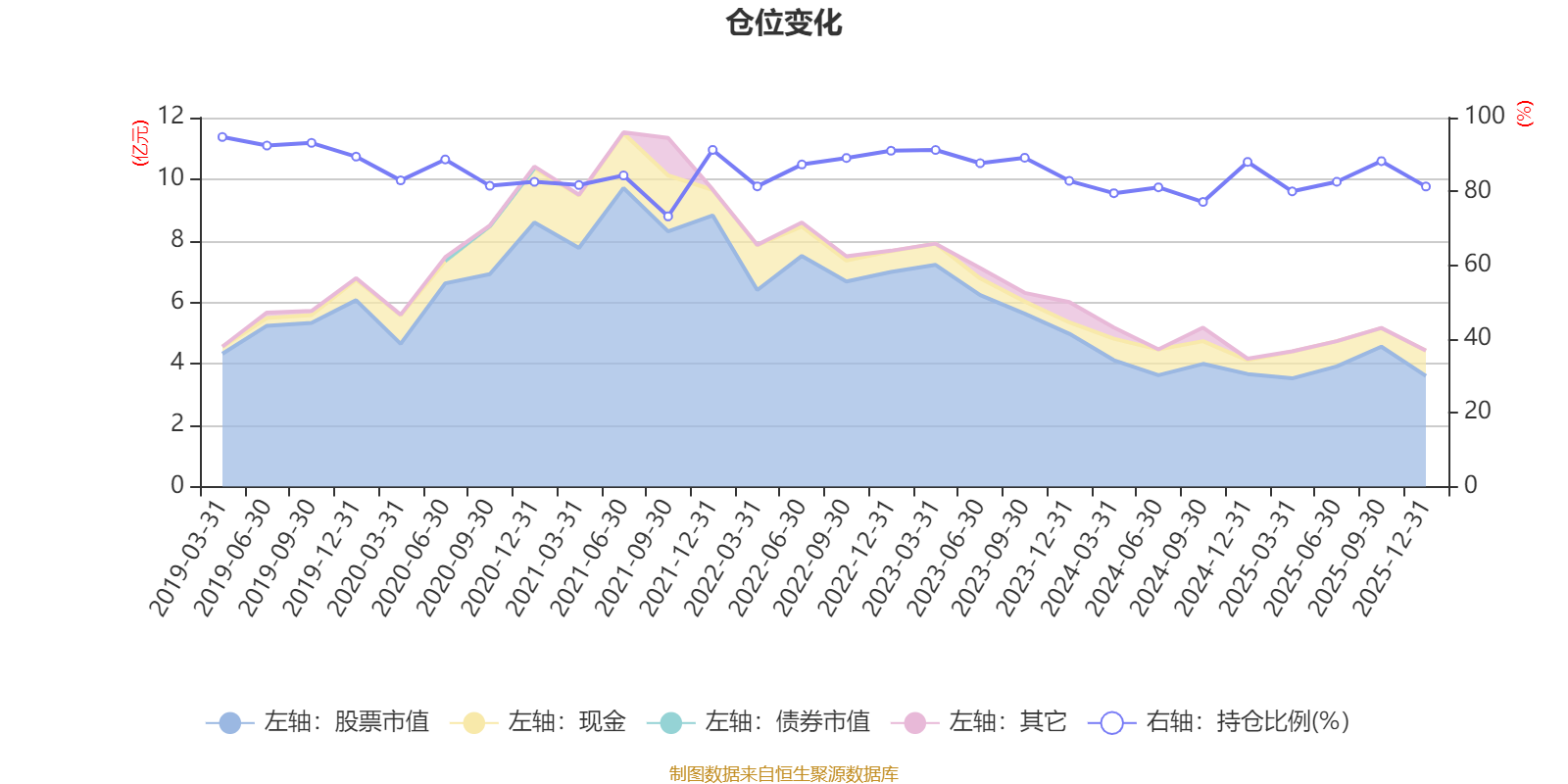 据定期报告数据统计,近三年平均股票仓位为84.06%,同类平均为88.23%。2019年一季度末基金达到94.75%的最高仓位,2021年三季度末最低,为73.24%。