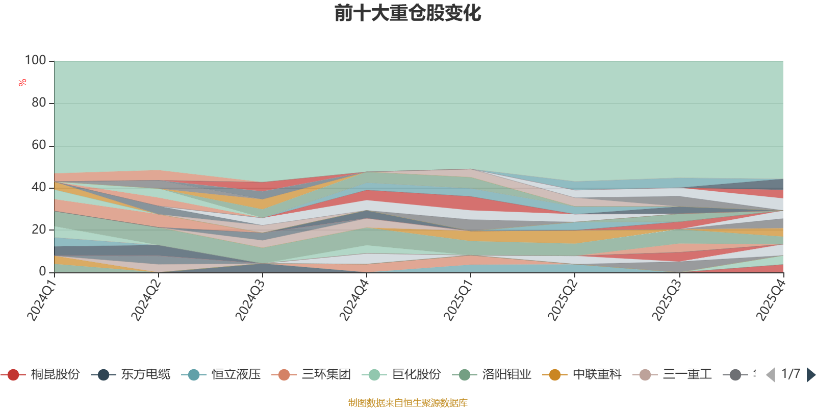 截至2025年末,基金十大重仓股分别是鼎龙股份、寒武纪、新凤鸣、中国平安、巨化股份、菲利华、紫金矿业、中矿资源、桐昆股份、海大集团。